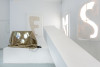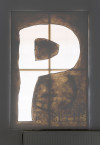 Verdichtet sich an dieser Stelle das Motiv des Psychoproblems, da der Film zudem schräg in die Wand füllende Fotografie eines sich im Spiegel erkennenden Babys projeziert wird, sitzt das Motiv des Problems im Allgemeinen an anderer Stelle prominent und großformatig mitten im Raum. Denn über jedes der fünf Fenster ist eine Leinwand platziert, auf der jeweils groß einer der Buchstaben des Ausstellungstitels zu lesen ist. In Negativform gemalt, so dass nicht das Motiv, sondern lediglich dessen Umgebung mit Farbe ausgefüllt ist, fällt durch die Buchstaben schummriges Licht in den Raum. Ein bisschen wie milchiges Glas sieht das aus oder wie die Haut einer Trommel und ist im Prinzip eine Art Effektmalerei, durch die die Probleme von Außen hineinströmen. Da die Bilder explizit gemacht wurden, um den Raum abzudunkeln und dadurch die Projektion des Films überhaupt erst zu ermöglichen, haben sie hier für ein Mal eine unhinterfragbare Aufgabe, wo sich mit der Tätigkeit des Kunst Machens doch ansonsten gerne mal die quälende Frage verbindet „Was, wie und warum eigentlich machen?“.