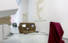 Für seine Ausstellung verwandelt er die Halle für Kunst in eine Art Kinosaal. Die Fenster sind abgedunkelt, auf die Stirnwand ist ein Film projiziert, davor mehrere Bänke oder Sockel zum Sitzen. Auf diesen befinden sich – quasi als Zuschauer:innen – einige Flatscreen-Skulpturen, die mittels über sie geworfener Felle und Stoffe, in die Löcher als Gesichter hinein geschnitten sind, personifiziert wurden. Die Stoffe wiederum sind mit Pflastern, Patches, Flicken und/oder Nähten versehen, wodurch angedeutet wird, dass hier etwas repariert wurde bzw. repariert werden musste. „When shit is complicated you keep on going“, „World gone totally mad!“ oder „No Future“ steht da beispielsweise auf den Patches (gestickt von den befreundeten Künstlern Victor Lizana und Mads Westrup) und lässt erahnen, was dies denn sei bzw. gewesen sein könnte, was zuvor kaputt war; mithin in welche Richtung die Issues und Probleme der einzelnen Skulpturen also gehen, die, da auf den Flatscreens verschiedene Videos laufen, zudem noch in ihrer je eigenen Welt verfangen, sozusagen ihren je eigenen Film zu schieben scheinen. Beispielsweise sind zwei Videos von Youtuber:innen zu sehen, die, als sei dies eine Therapiesitzung, stundenlang über Gott und die Welt mit der Kamera bzw. dem ihnen unbekannten Publikum sprechen.
