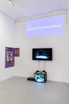 Other works of the show allude in a more general way to the theme of (radioactive) disaster. Lucie Stahl’s work, for example, is based on her childhood memories of the atomic accident of Chernobyl in 1986. Terry Riley’s piece is the soundtrack of Bruce Conner’s film »Crossroad« from 1976 that shows images of the explosion of an atomic bomb on the Bikini atoll in 1946 in extreme slow motion. Also strongly influenced by music is the work of Alivia Zivich, who with Nate Young ran the Detroit noise music label »AA Records«, whose band »The Demons« in turn wrote the soundtrack for Zivich’s videos »Life Destroyer« and »Head Threeways«, which is projected onto her painted cloths. Henning Bohl’s drawing loosely refers to the literary genre of »Cosmic Horror« with the lettering »Fatal« and thus evokes dystopic and apocalyptic scenes; a motif against which one can also read the gray-black works of Anita Leisz, the works of Kitty Kraus or the sci-fi-like android theater of Oriza Hirata/Seinendan.