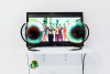 The motif of radioactivity, radiation and energy as a purely physical phenomenon is the starting point of a series of further works of the show. Ariane Müller’s video »Marie Curie oder jahrelang im Wohnzimmer und nur lesen«, for instance, shows a woman reading the diary of the physicist and rubbing her fingers, from which sparks emanate. Erika Kobayashi’s dollar sign object, made of uranium that glows in ultraviolet light are also based on a narration having to do with Marie Curie, who used pitchblende (a mineral uraninite) from Joachimsthal in the Czech Republic for her research on radium, for which she received the Nobel Prize as the first woman. Yuki Okumura’s work uses email communication on a fluorescent picture, which due to this quality was assessed as potentially highly sensitive by the museum staff, to demonstrate the purely projective and paranoid equation of glowing = radioactivity = dangerous. Jay Chung’s & Q Takeki Maeda’s »March Painting«, in contrast, is painted with a pigment, Nano Prussian Blue, that can indeed be associated with radioactivity, but was originally used to dye Prussian military uniforms blue. Since it binds radioactive cesium, scientists are currently investigating whether it can be used to decontaminate radioactive areas. Referencing the picture by Chung & Maeda, Henning Bohl and students of his class at the University of Applied Arts Vienna in a workshop with Ei Arakawa titled Mutant Autopilot Brushes developed the song »Nano Prussian Blue« and painted so-called 'mutant' pictures with precisely this pigment that are presented along with the song in a 'karaoke stage installation'. The work by Pratchaya Phintong also deals with a recent scientific discovery, in this case with methane hydrate that is deposited in huge amounts on and under the sea floor and considered a potential source of energy for the future, even though its extraction is extremely risky and could have far-reaching effects on the climate. A purely fictive source of energy, or energy production, is at the center of the work »L△▽△ L△▽E« by Kerstin Brätsch/UNITED BROTHER/Sergei Tcherepnin/Stefan Tcherepnin, a sort of science fiction in which mysterious agents merge with the earth’s lava energy. This utopian vision and fiction of energy and light places the work close to that of August Wenzel Hablik, an artist of the early 20th century, for whom visionary utopias played a pivotal role in the form of utopian crystals and light architectures.