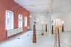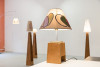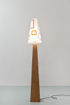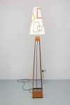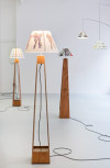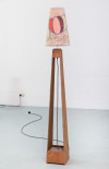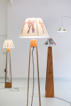 Many lamps are placed in the room or hang into it in a broad arc, as wall lamps. With their pedestals made of mahagony plywood and curved aluminium tubes and the shades decorated in various motifs, the lamps of Marc Camille Chaimowicz illuminate the gallery space in an entirely different fashion than the neon tubes customary in art today. Since the 1980s, Marc Camille Chaimowicz has been making furniture and fixtures once associated with the domestic realm, such as wallpaper, carpets or ceramics. What plays a pivotal role in his artistic practice is the desire for fictions about aesthetic lifestyles between hedonism and functionalism. A formal minimalism counterbalances the ornamental and sweetish romantic aspects of the works. His objects and installations additionally are often underpinned by a nostalgic and partially touching flair; Chaimowicz has a relaxed relationship to kitsch with which he creates a tension to the occasional melancholic undertones of his choreographies. Marc Camille Chaimowicz often arranges different furniture sculptures and objects to still lifes in the gallery space that allude to a speculative lifestyle and refined culture of taste. His presentation in Lueneburg is therefore extraordinary in that it focuses on a single object type, the lamp. And despite the latent “living room atmosphere”, the presentation at Halle fuer Kunst avoids such a fictional mise-en-scène. Instead, the serial hand-made production of articles of daily use is here now brought to the fore.